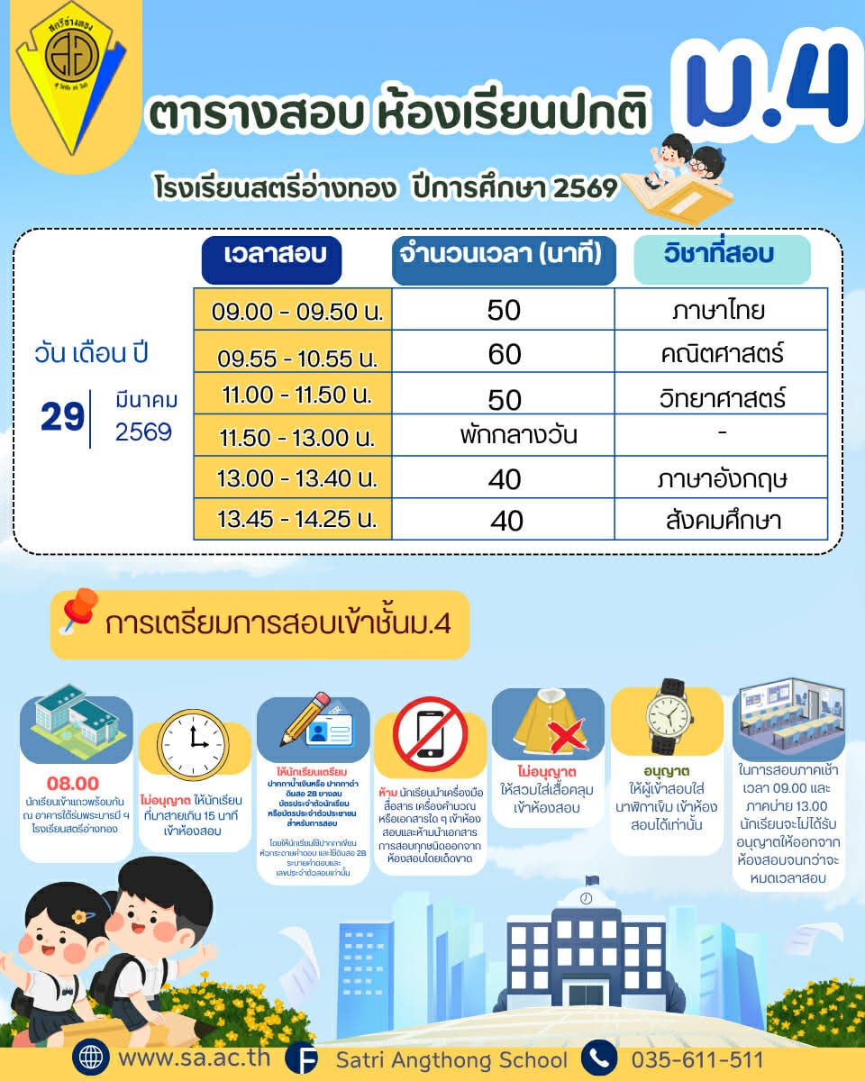 ประกาศโรงเรียนสตรีอ่างทอง เรื่อง การรับนักเรียนเข้าเรียนต่อขั้นมัธยมมศึกษาปีที่ ๔ ปีการศึกษา ๒๕๖๙ (โครงการห้องเรียนพิเศษ) รอบเพิ่มเติม